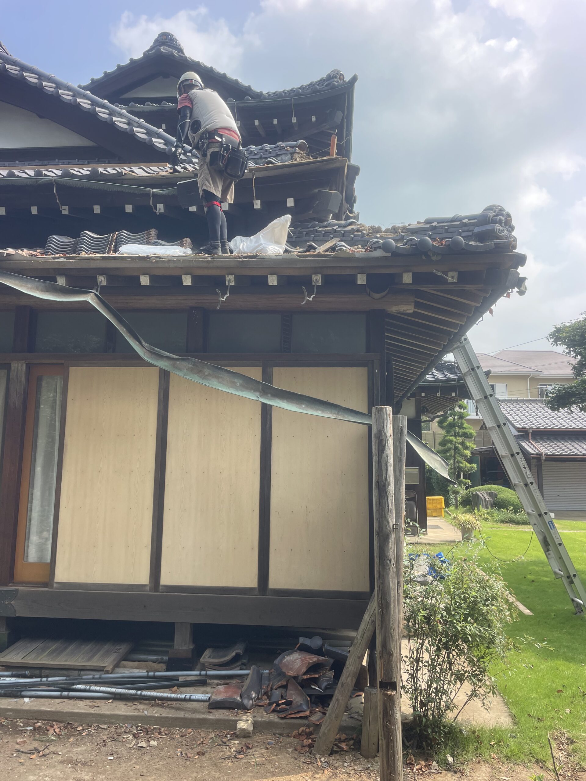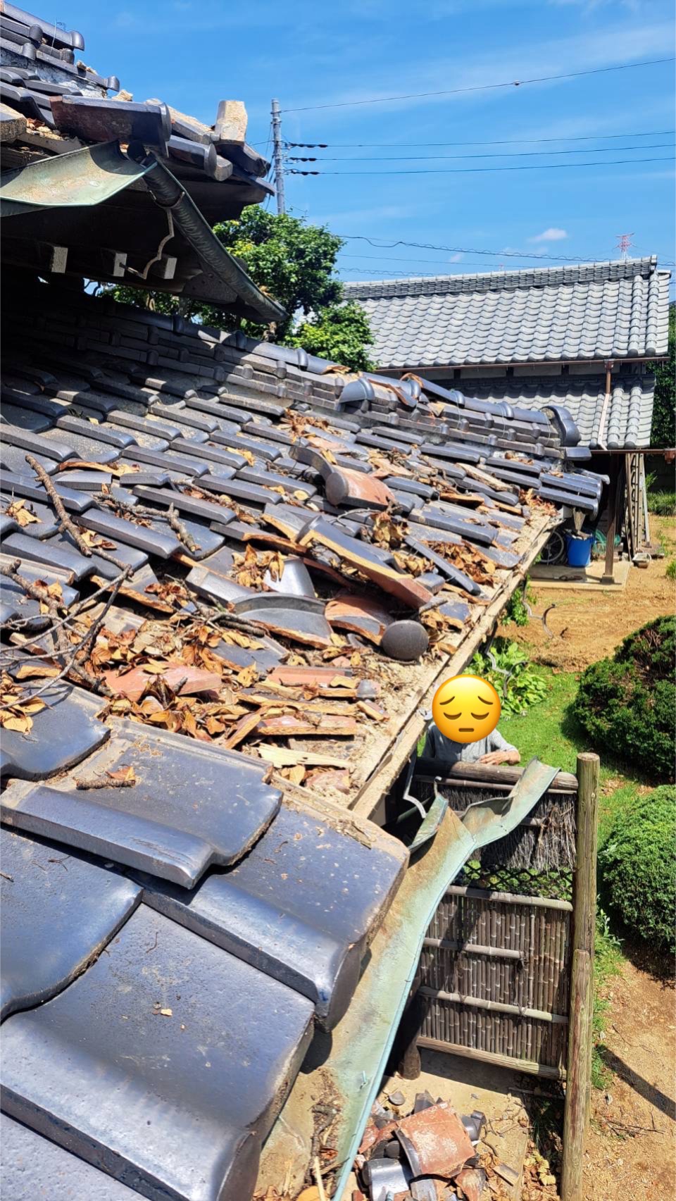 屋根瓦の一部が飛び、割れた瓦が散乱。
