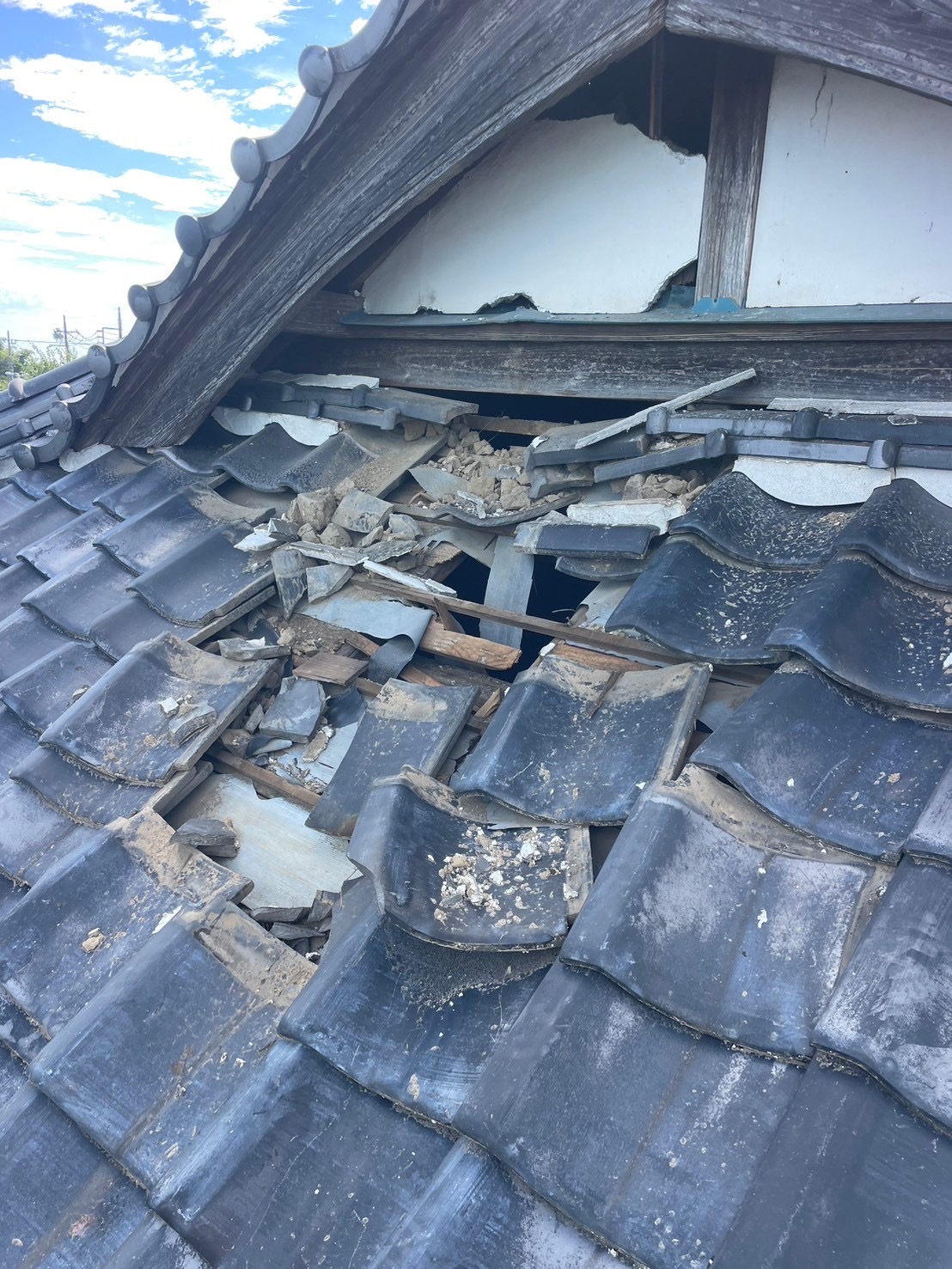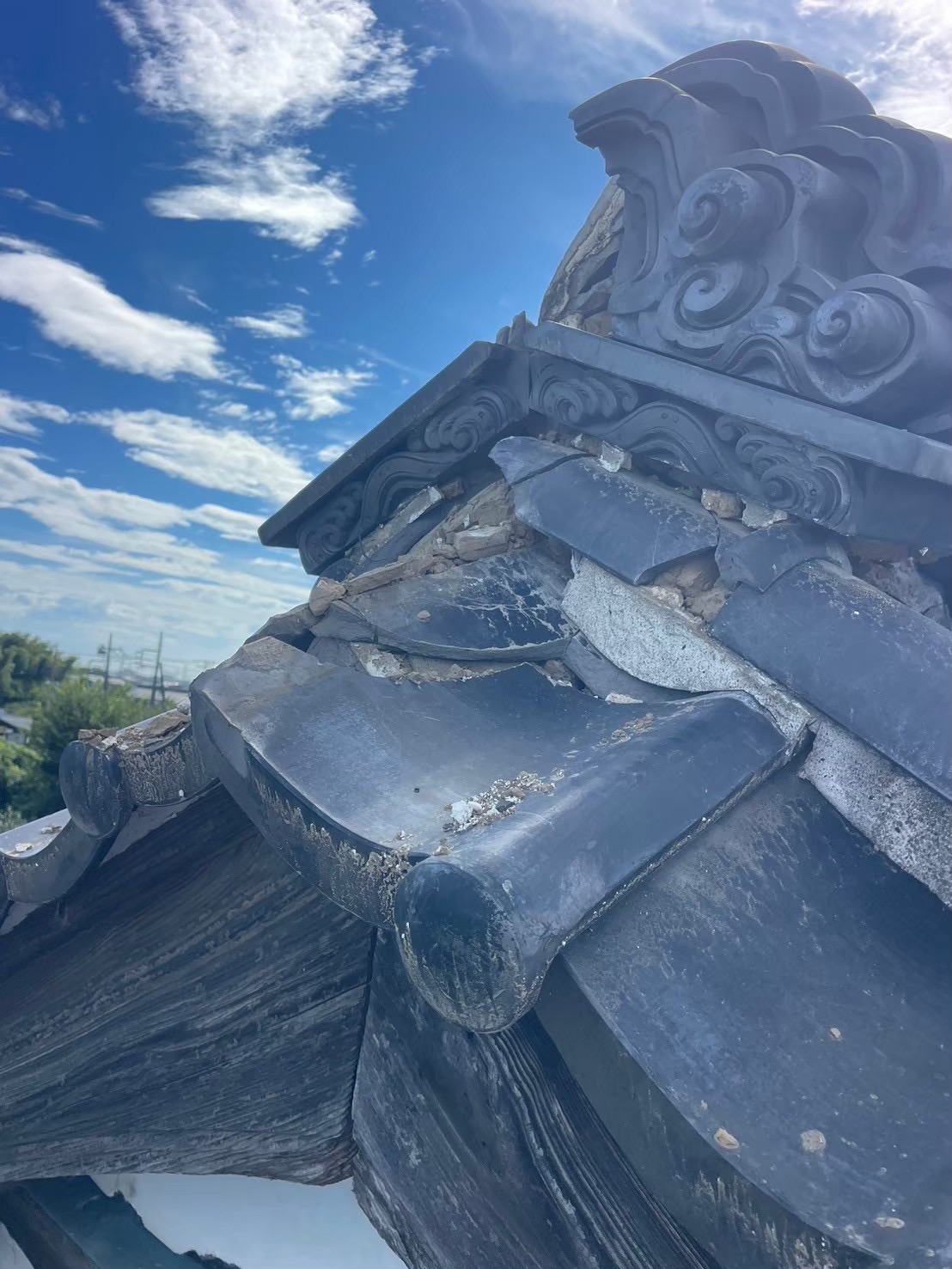 なんと、2階屋根の大きな鬼瓦に落雷があり、鬼瓦が真っ二つに割れてしまったのです。