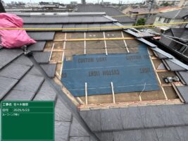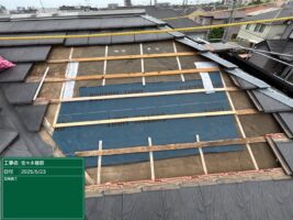 防水処理を終えたら瓦用の桟木を留め付て最後に既存の瓦を戻して完了です。