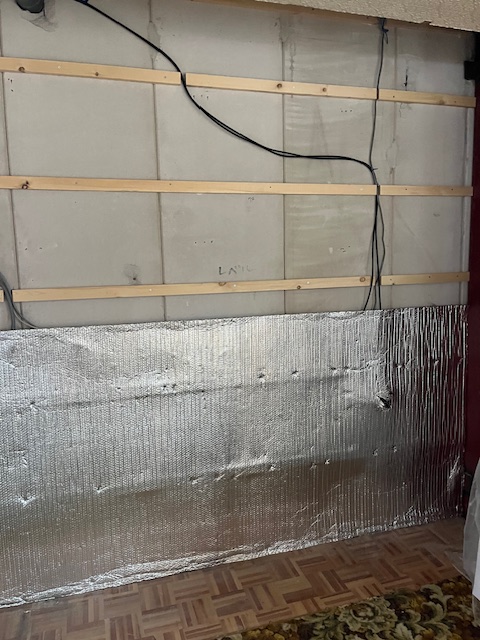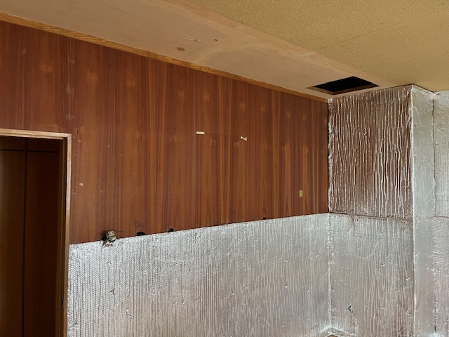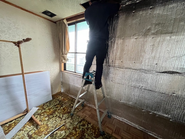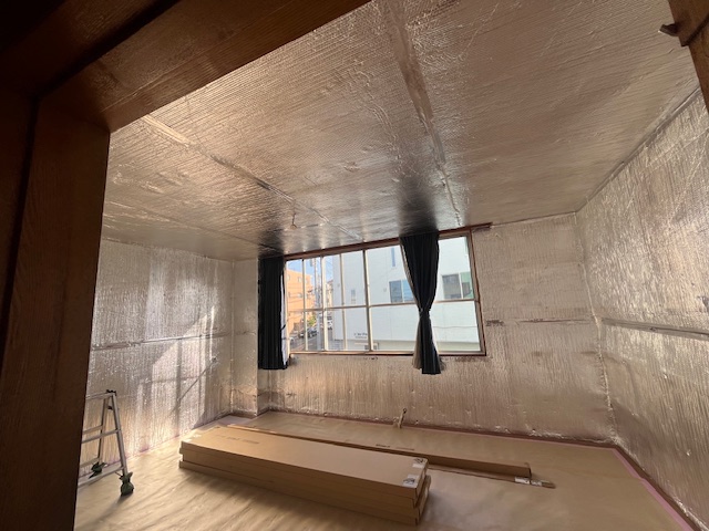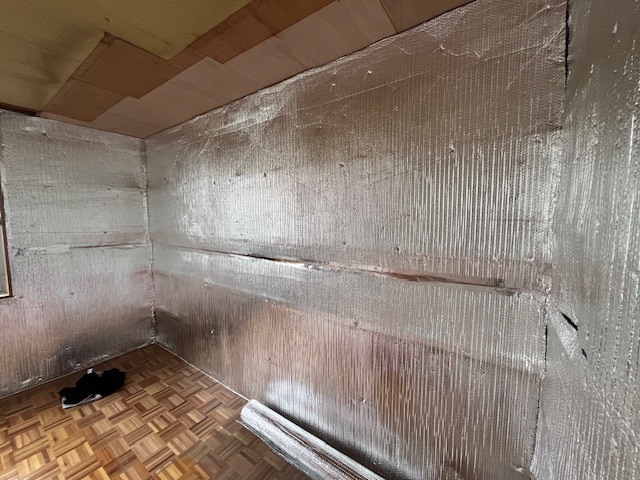 弊社の2階ですが、隣が水回りもありカビの匂いと外気に影響されやすい室温の環境でしたので遮熱材リフレクティックスを室内側から施工しました