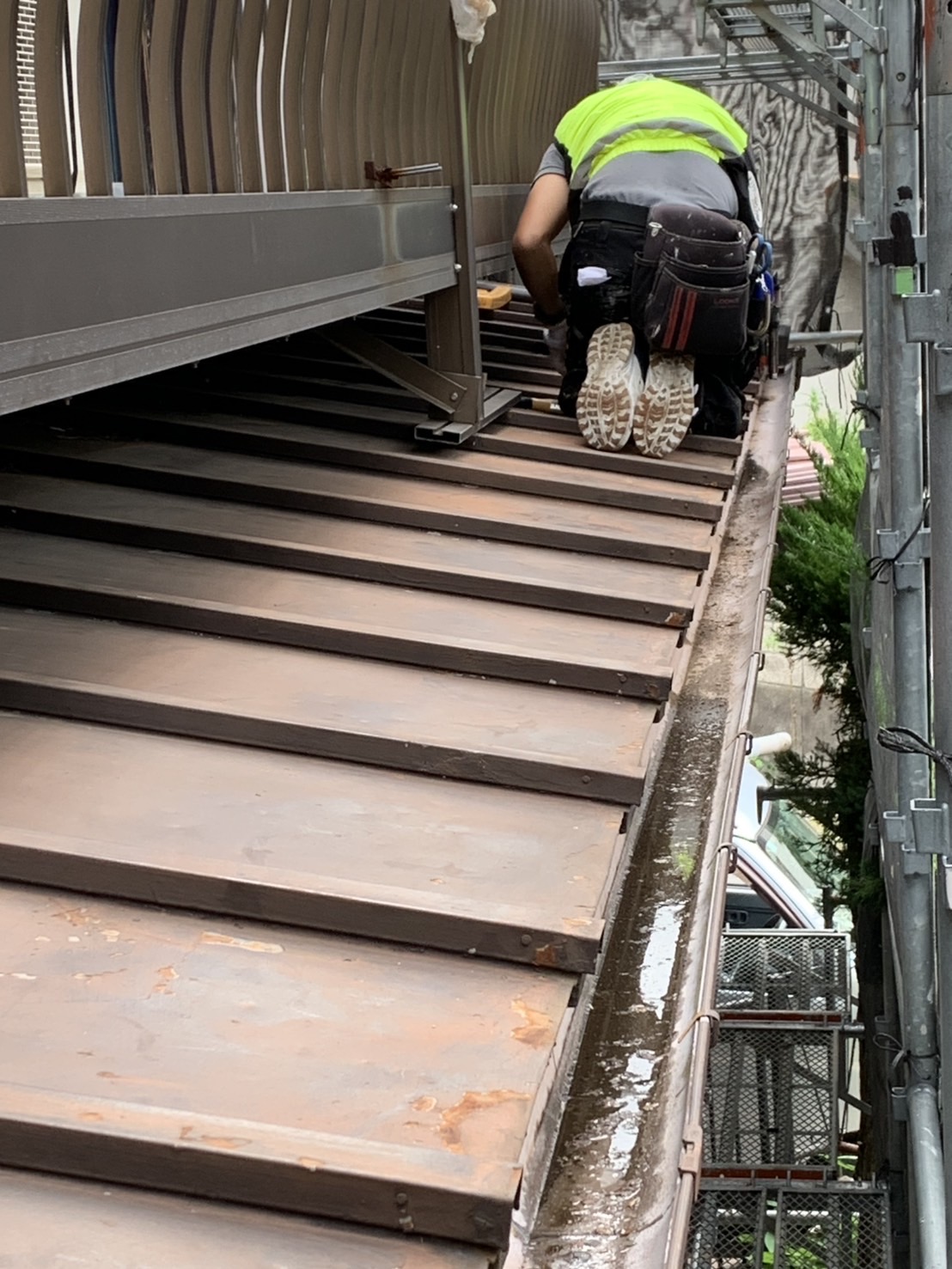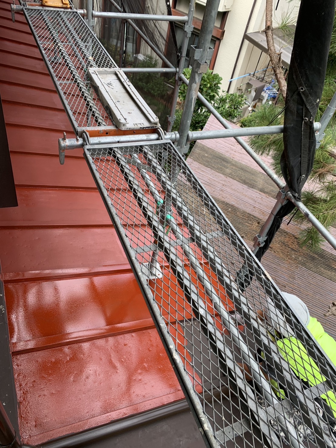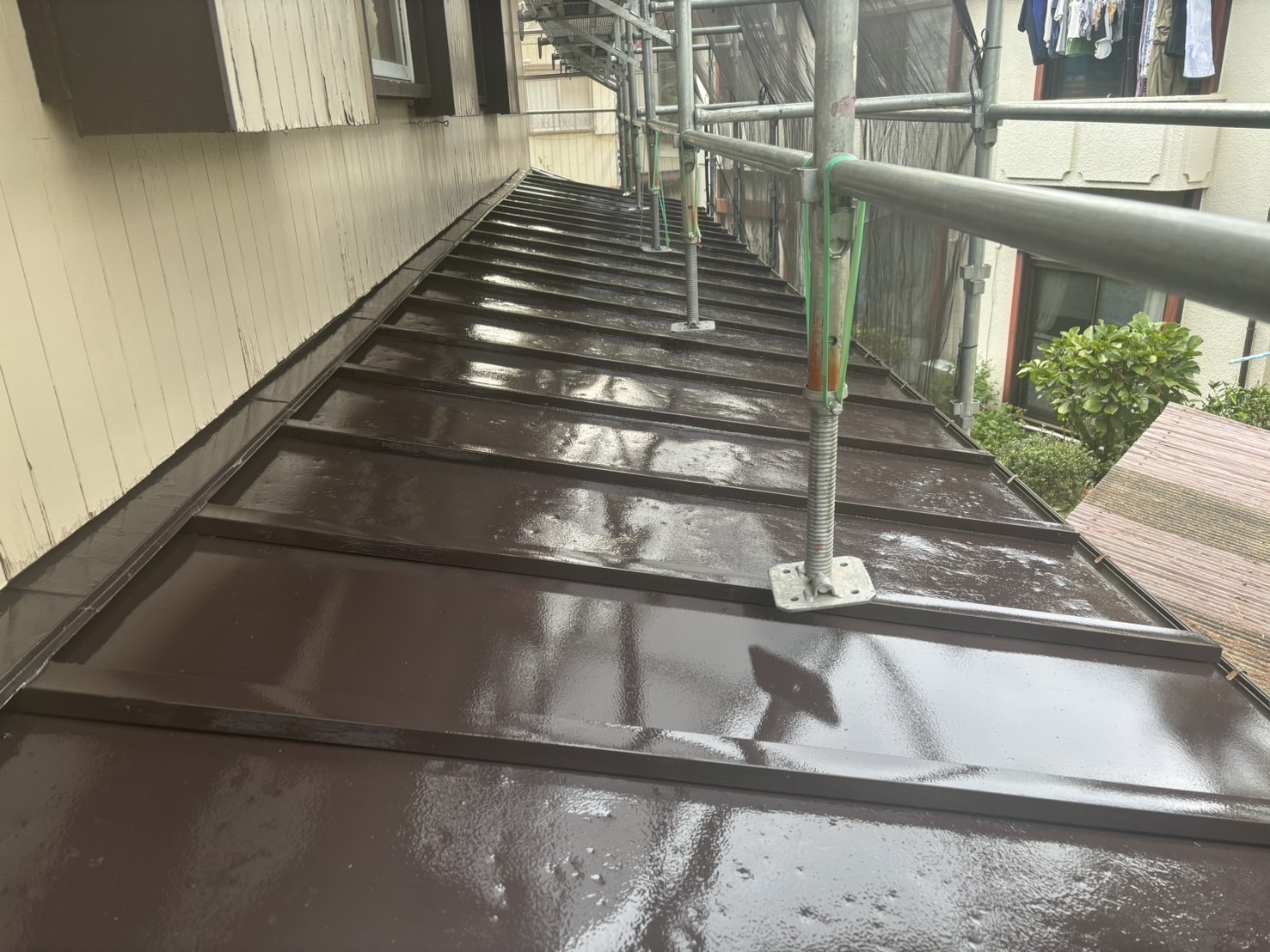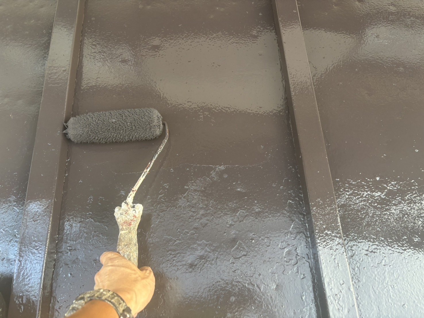 先日行った瓦棒屋根の補修工事に続き、仕上げとして塗装工事を実施しました。