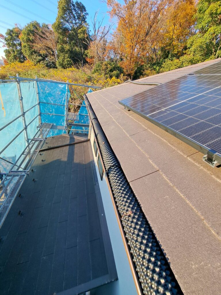 勾配がきつい箇所やソーラーパネルが乗ってスペースが狭い箇所、年数が経っていると屋根自体が滑るため、どうしても足場が必須です。