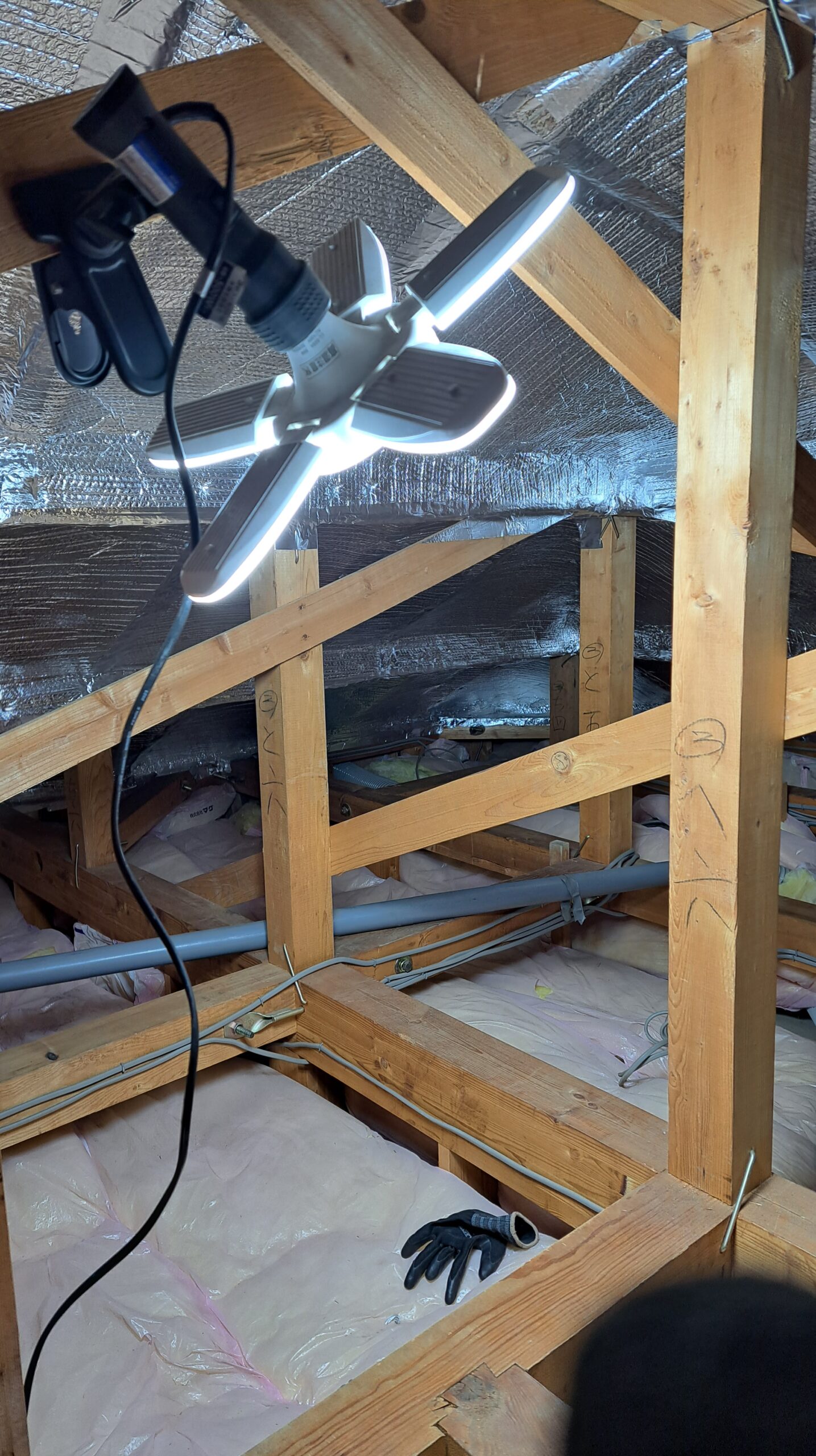 小屋裏内部は当然ながら真っ暗なため、持ち運び可能な照明を設置し、安全を確保しながら施工を行いました。